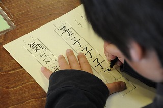 東京都小学校書写研究会の研究発表会の研究授業を行っています。姿勢をよくし、「まがり」や「そり」に気をつけて、字の練習をしています。