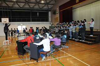 感謝の会の準備として、音楽の練習をしています。素晴らしい演奏です。