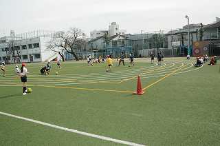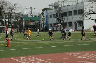 ボールを足で扱うことに慣れるために、ゲームをしています。まず、ドリブルをしながらじゃんけんをしています。