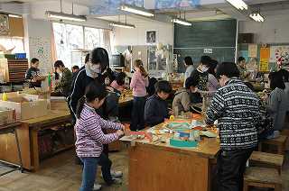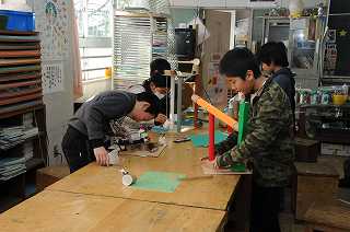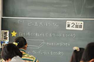 「ビー玉大ぼうけん」をテーマに、板を傾けて転がるビー玉ワールドを作っています。
