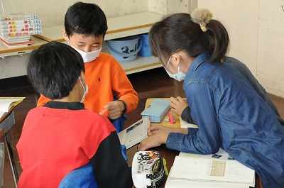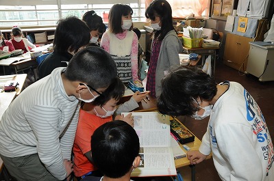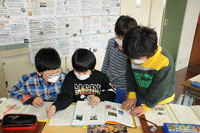 「本で調べて報告しよう」の単元で、実際に本を見て決めたテーマを調べています。