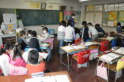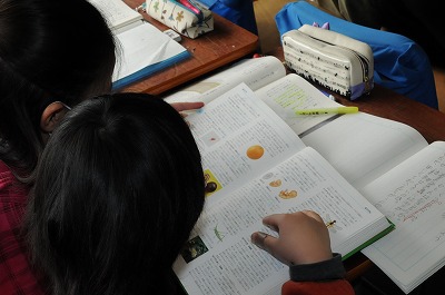 「本で調べて報告しよう」の単元で、実際に本を見て決めたテーマを調べています。