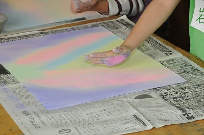 「春のようせい」をテーマにチョークを使って春色画用紙を作り、春の景色を書いています。春色画用紙を作っています。