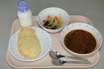インドでは、スパイスを使った煮込み料理をカレーというそうです。種類も味も材料や家庭によっていろいろあるそうです。今日はキーマカレーです。キーマカレーはひき肉のカレーだそうです。今日は豚肉で作りました。ナンにつけて食べます。