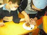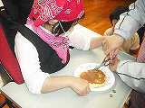 明日のひな祭りを前に、パンケーキからおひな様を作ります。