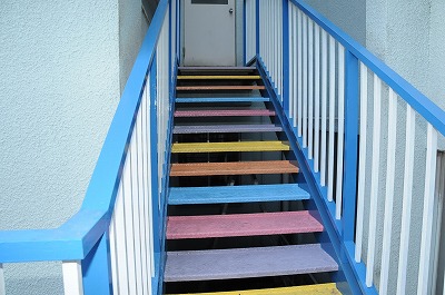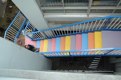 非常階段の色を塗り替えています。とてもカラフルな階段になりました。