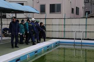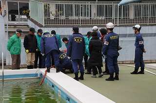油面住区防災訓練が行われています。ここでは、D級ポンプの使い放水訓練をしています。