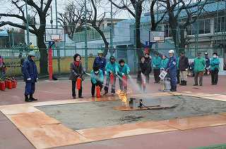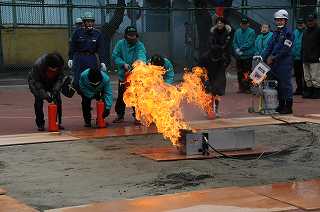 油面住区防災訓練が行われています。ここでは消火器を使って、初期消火訓練をしています。