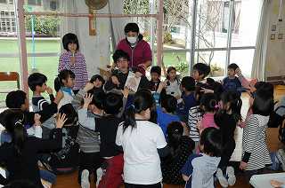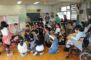 わかたけの子どもたちと、2−2の子どもたちとの交流で、じゃんけんゲームをしています。