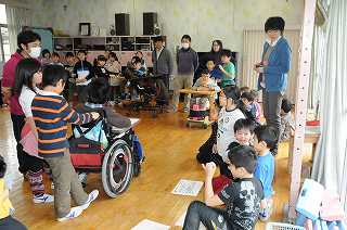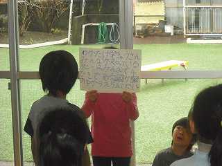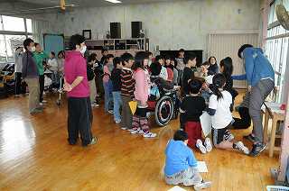 わかたけの子どもたちと、2−2の子どもたちとの交流で、○×ゲームをしています。