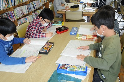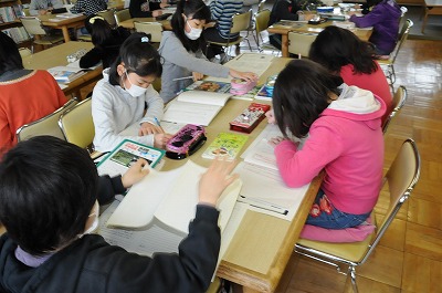 「本で調べて報告する」の教材で、自分でテーマを決めて調べています。