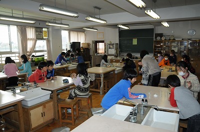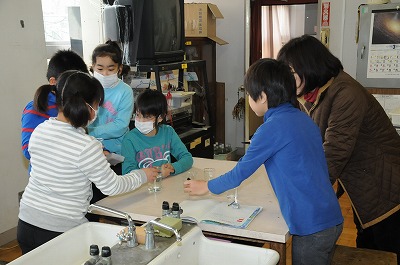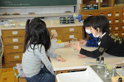 同じ体積の水と塩水の重さを比べる実験をしています。