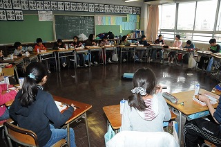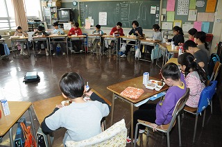 6年生を送る会の後、縦割り班ごとに給食を食べています。