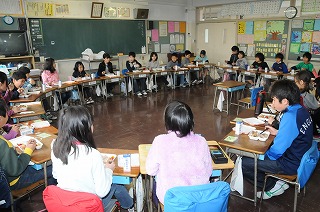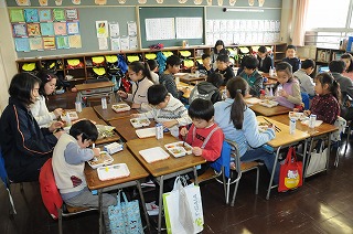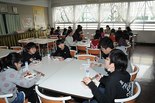 6年生を送る会の後、縦割り班ごとに給食を食べています。