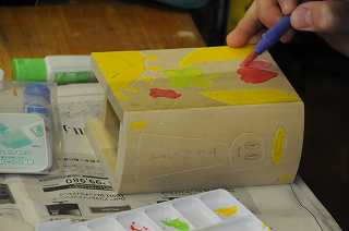 ブックスタンドに彫刻し、着色して完成に近づけています。
