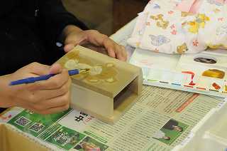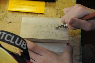 ブックスタンドに彫刻し、着色して完成に近づけています。