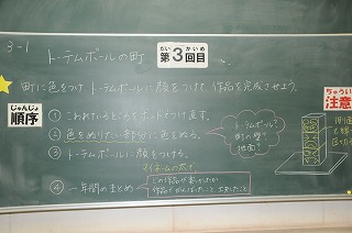 「トーテムポールの町」テーマに、町に色をつけ、トーテムポールに顔をつけて作品を完成させています。