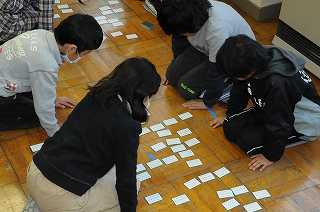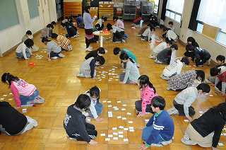 3年1組と4年1組の子どもたちが合同で百人一首のゲームをしています。