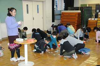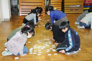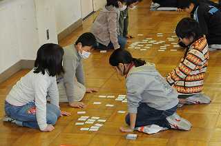 3年1組と4年1組の子どもたちが合同で百人一首のゲームをしています。