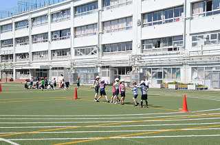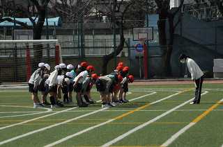 今日の体育はボールけりゲームです。まず、あいさつから始まりました。