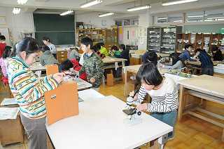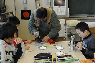 食塩とミョウバンの結晶を、顕微鏡で観察しています。