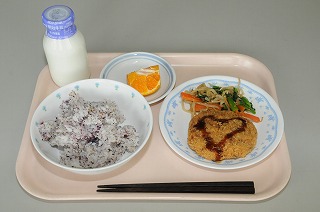 ゆかりごはんは、油面小の人気メニューです。赤じそから作られたふりかけと、炒ったごまを混ぜました。赤じそは赤い色とさわやかな香りが特徴です。赤じそは、梅干しを赤く染めるために使われます。この赤い色も栄養の一つとして研究され、注目されています。