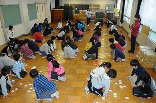 3年1組と4年1組が、百人一首の対戦をしています。