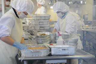 今年度最後の給食の調理が進んでいます。今日は卒業お祝いメニューです。