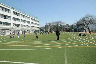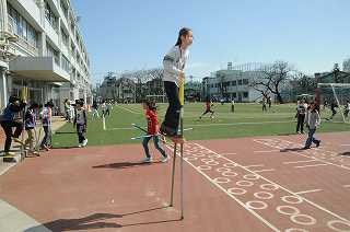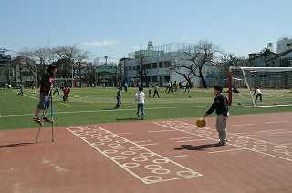 暖かい春の日差しの下で、たくさんの子どもたちが校庭で遊んでいます。