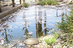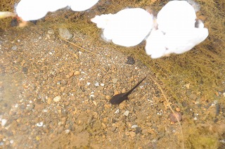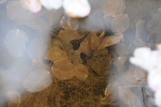 桜の花びらが浮かぶ池でたくさんのオタマジャクシが泳いでいます。