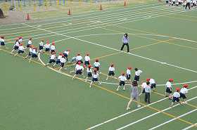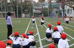 準備運動の後で、かけっこをしています。