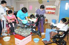 どじょうを水槽に移しています。