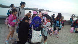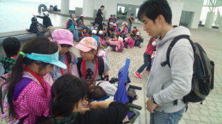 葛西臨海水族館にいます。グループの見学時間が終わり集合場所に集まっています。待っている間にわかたけとの交流をしています。11:30