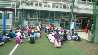 今日は2年生が葛西臨海公園・水族館に遠足に行きます。子どもたちが集合し、出発式を行っています。