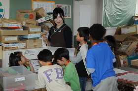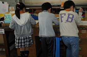 図工室を探検して見つけたことを、画用紙にまとめています。