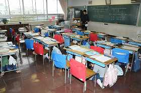 地震の放送とともに、子どもたちはまず命を守るために机の下へもぐります。揺れがおさまった後で、静かに教師の指示を聞き、素早く避難します。