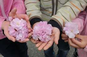 校門のところで咲いている八重桜を拾って見せてくれました。