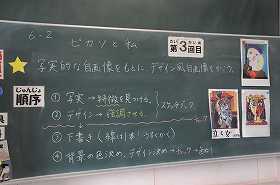 「ピカソと私」をテーマに、自分の特長を生かした自画像を書いたあとで、デザイン風にアレンジしています。