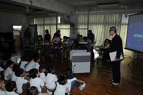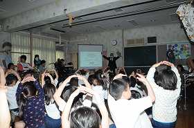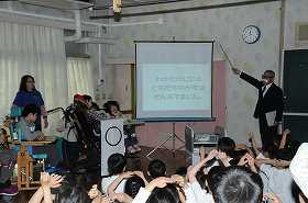 わかたけのことを何でも知っている博士が、わかたけ学級の問題を出し、わかたけ学級の子どもたちが答えを表示します。1年生は○×で答えます。