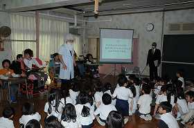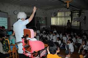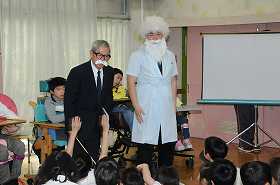 わかたけ学級のことを何でも知っている博士が、助手といっしょに登場しました。これから1年生にわかたけ学級に関するクイズを出します。