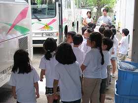 今日はわかたけ学級の子どもたちと1年生が交流をします。1年生が会場へ行く途中で、通学用のバスの話を聞いています。
