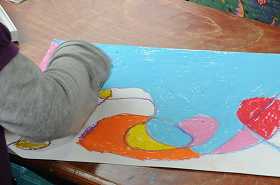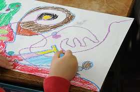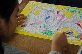 画用紙の模様に色を塗っています。おもしろい模様ができています。