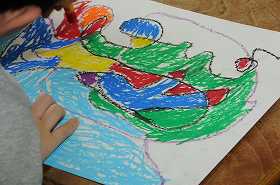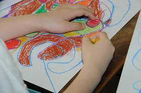 画用紙の模様に色を塗っています。おもしろい模様ができています。