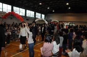 離任式に10名の先生方や主事さん方が来てくださいました。まず、子どもたちの拍手に迎えられ、アーチの下を入場しました。