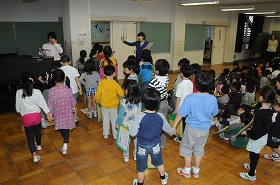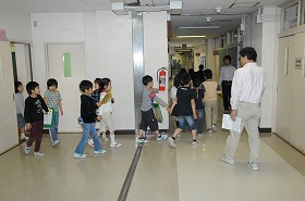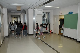 1年生と2年生がグループごとに学校探検を始めます。