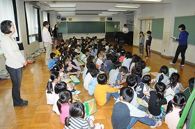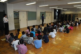 今日は2年生が1年生を連れて学校探検を行います。まず、やり方の確認をしています。