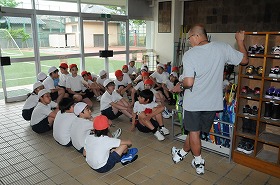 外で体育を始めましたが、途中で雨が降ってきたため、昇降口でリレーについて確認しています。
