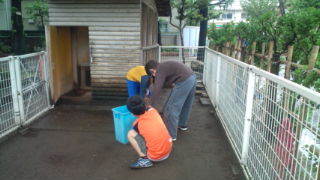 連休中にもかかわらず、当番の子どもたちが、うさぎの世話をしています。