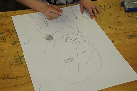 「ピカソと私」をテーマに、自分の特長を生かしてデザイン風自画像の下書きを描いています。