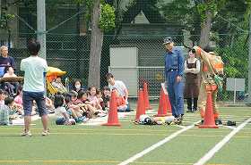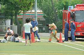 身を守るお話の後で、消防士さんが火事の時に使う服を実際に着てくださいました。